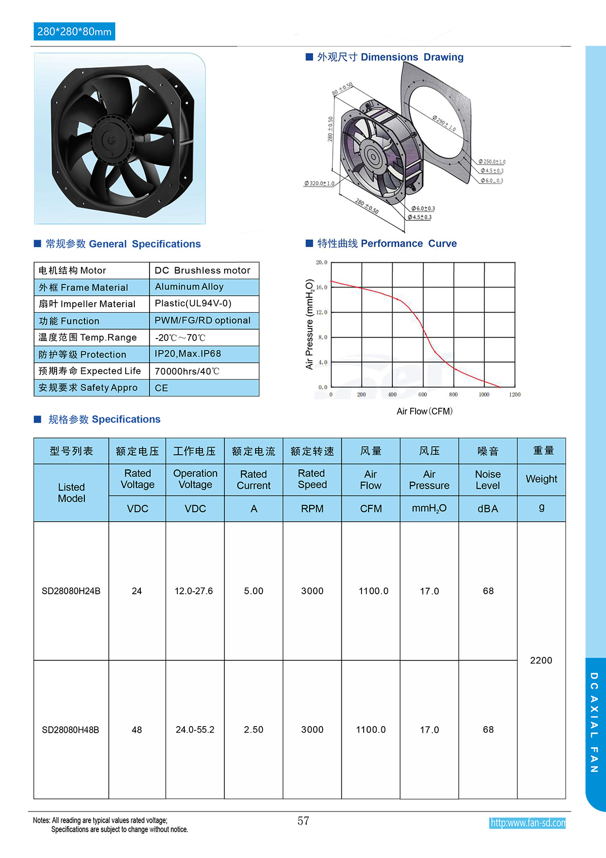 ● Frame: Aluminum alloy, Impeller: Thermal Plastic, UL 94V-0